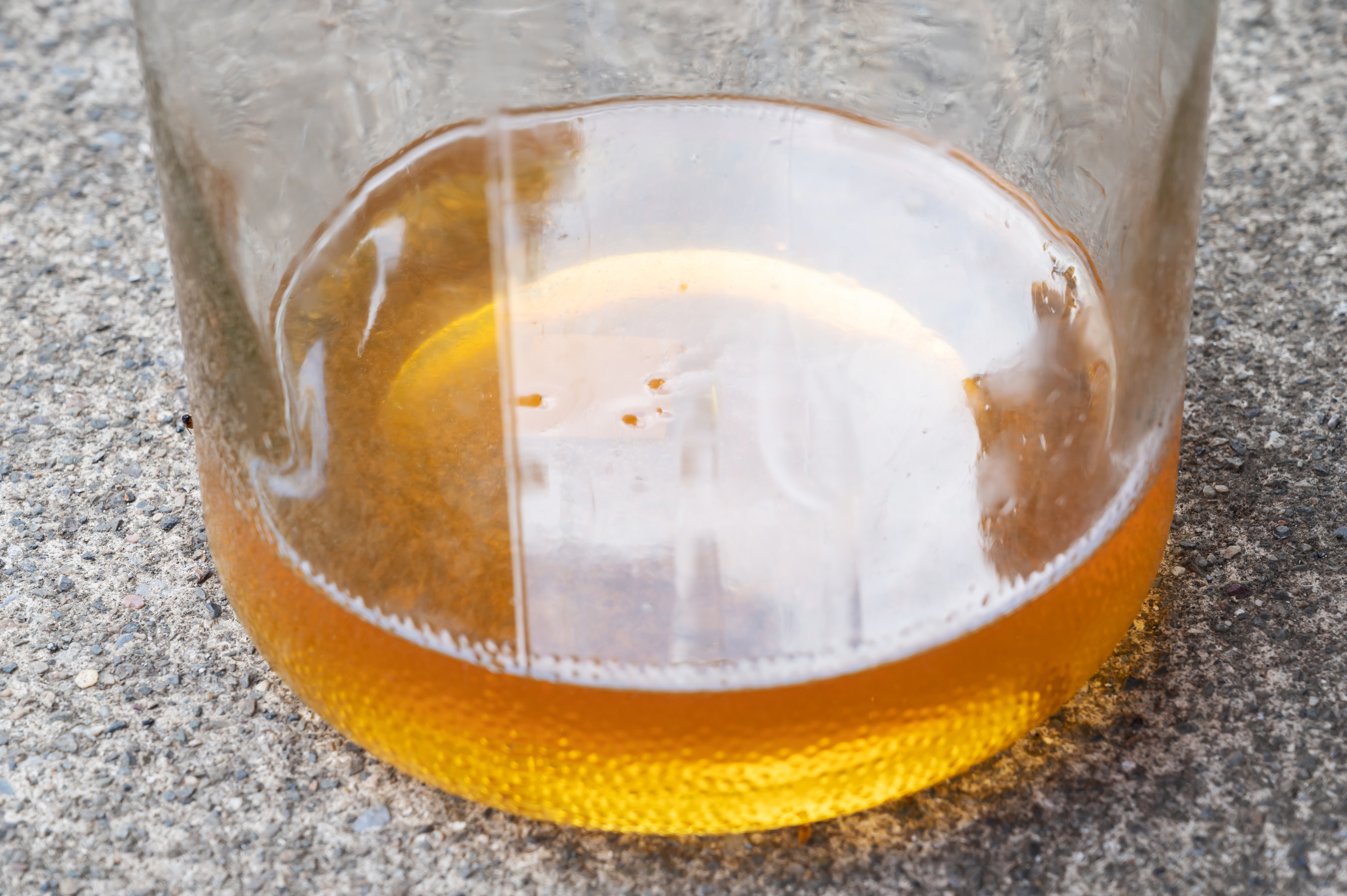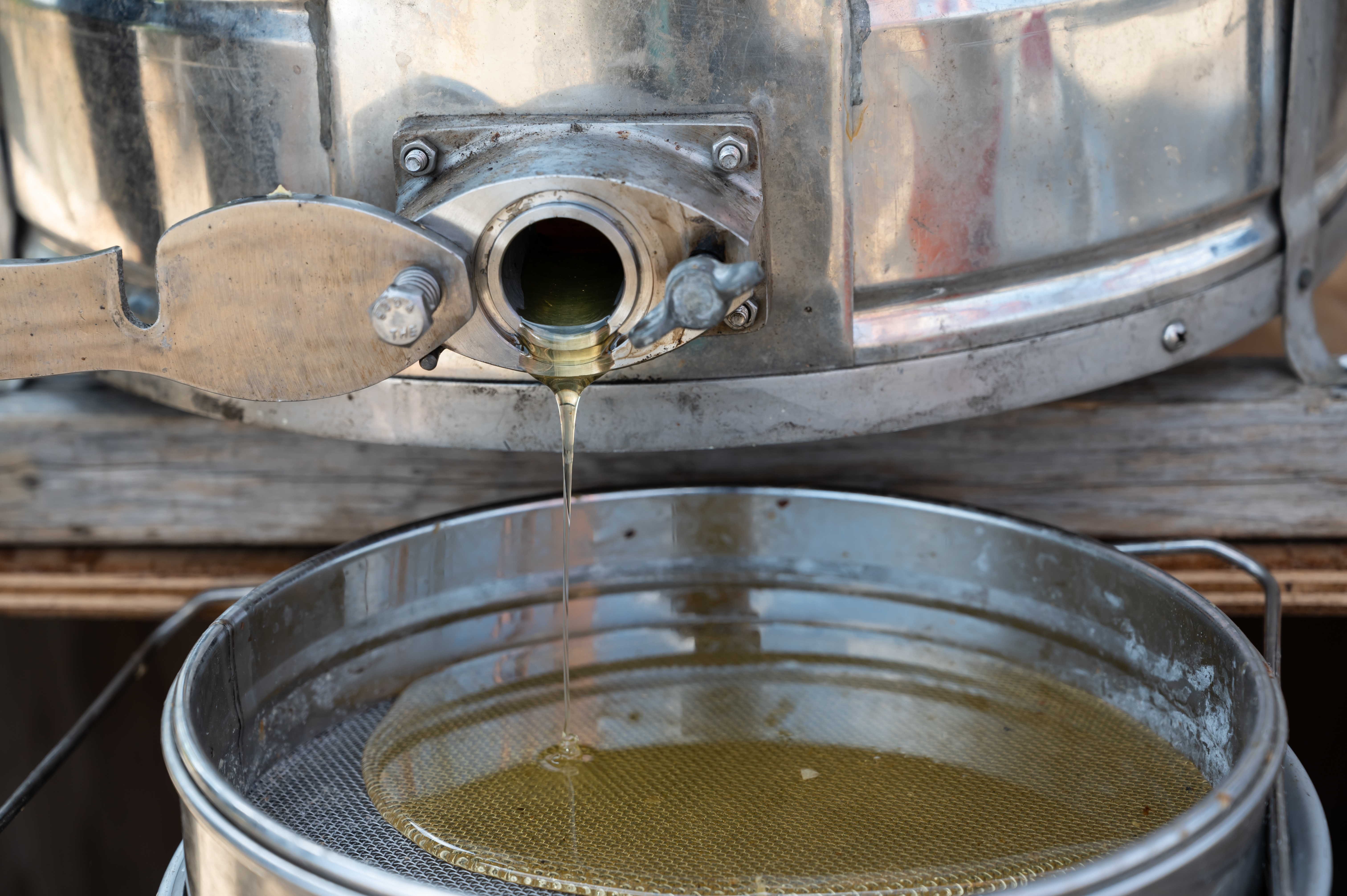 ハチミツ搾り機の中に板(巣枠)を入れ、ハンドルを使いガランガランと手動で板を回転させると、遠心力で板の中のハチミツが搾り機の中にたまり、底の穴からトロリと出てくる。