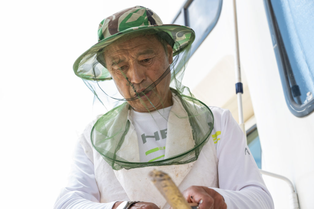 対照的に根津さんは採取量が最も多くなる5月と6月の2カ月しか採蜜しない。このやり方だと、秋と12月の年2回、一般的な養蜂と比べて半分以下の消毒回数になるため、蜂に無理な負担をかけずに済む。12月の消毒の時期から約半年間はしっかりと管理を行い、消毒からなるべく時間をあけてハチミツを搾るという、サイクルだ。