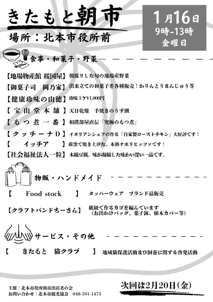 今月もきたもと朝市開催します!皆様のお越しをお待ちしております。